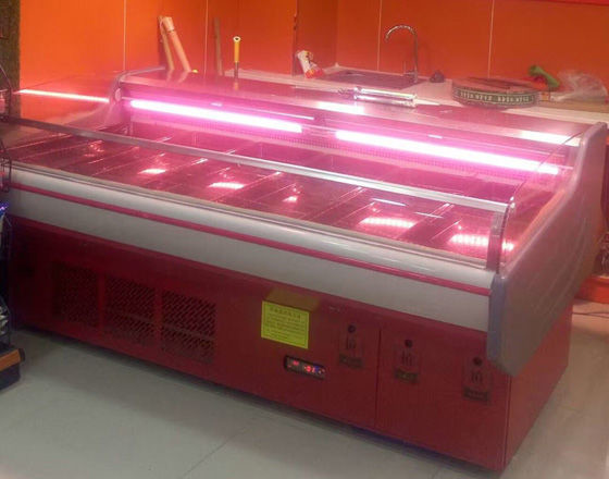 4、外表是用家電彩鋼板,底座架子是采用方鋼材質。使豪華鮮肉柜柜體既持久耐用,又美觀大方。